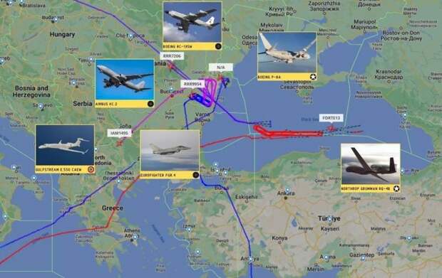 По данным сервиса Flightradar24, вчера во второй половине близ российского побережья в воздухе находились британский Boeing RC-135W Rivet Joint, американский Boeing P-8A Poseidon, итальянский Gulfstream G550, американский БПЛА Northrop Grumman RQ-4B Global Hawk и британский заправщик Airbus KC2 Voyager.